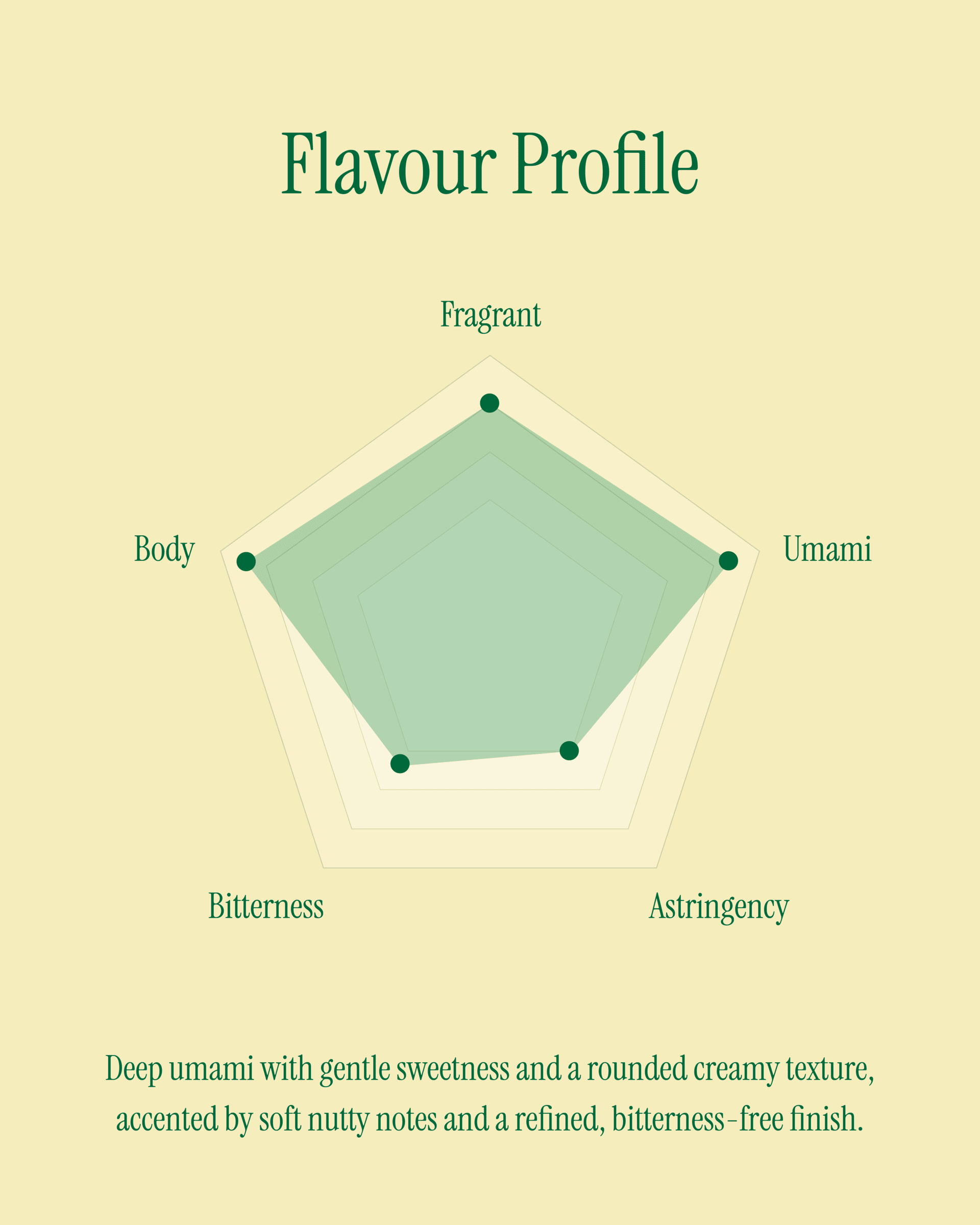 A deeper, more expressive matcha with a mild sweet opening that builds into a rich, creamy body. Fresh green notes and subtle almond-like nuttiness come through clearly, with a super sweet fragrant aroma, zero bitterness and a lingering nutty mouthfeel.
